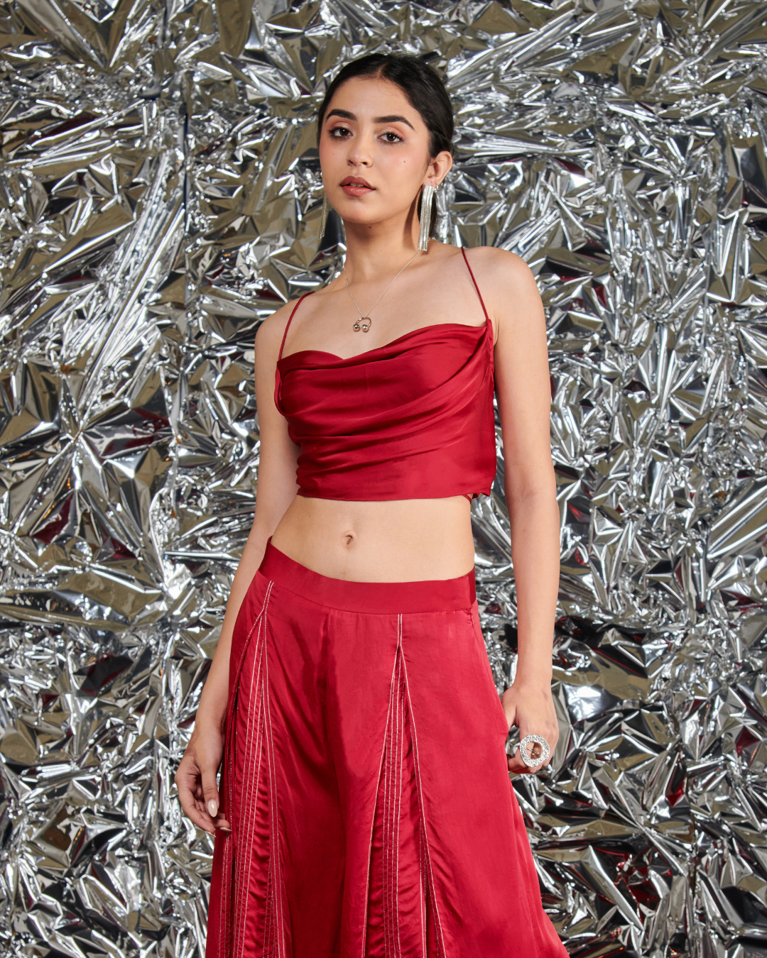 Chilli Red Strappy Cowl neck Top with Criss Cross Tie-Up Back | Premium Crepe Satin