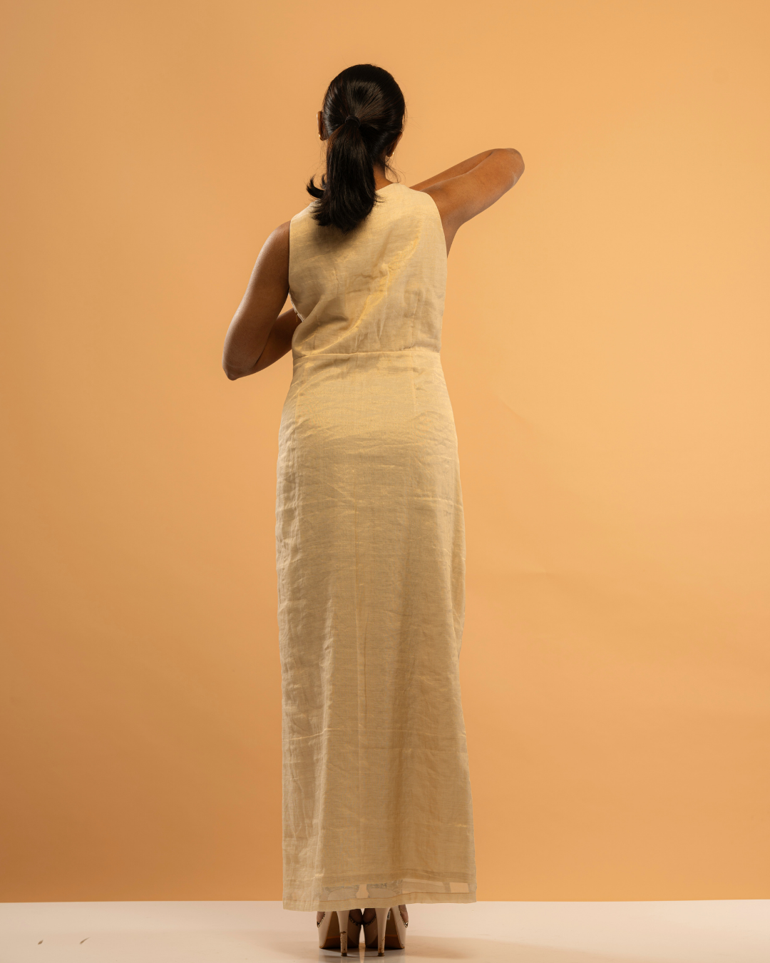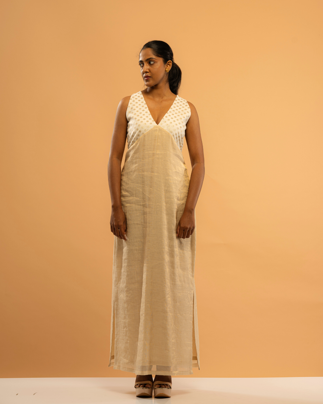Illuminate your Onam celebrations with our exquisite deep V-neck slit dress, crafted from luxurious cotton. The bodice is beautifully adorned with shimmering golden motifs, adding a touch of opulence and grace. The deep V-neckline frames the face elegantly, while the side slits enhance the dress’s flow and modernity, allowing for effortless movement and a chic silhouette. This dress combines the softness of cotton with striking design elements, creating a perfect balance between comfort and style. Ideal for festive occasions, it transforms traditional elegance into contemporary flair, making it a standout choice for celebrating Onam in style.