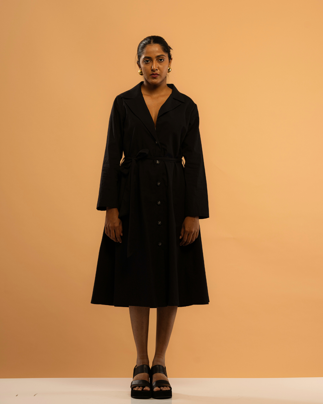 Meet the Urban Edge Black Belted-Trench Dress amongst the urban jungle. Crafted from sumptuous cotton, it merges modern sophistication with a relaxed, comfortable fit. The shawl collar exudes an air of regal grace, while the embroidered buttons add a touch of intricate detail. Full sleeves provide both elegance and protection against the elements, and the detachable belt allows for versatile styling. This trench dress transforms every stride into a statement of power and poise, making it your go-to piece for commanding attention and showcasing effortless style in any setting.